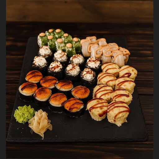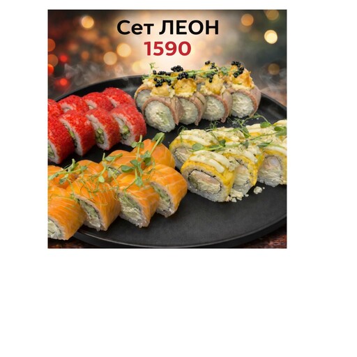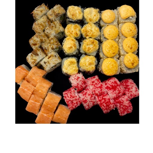Креветон хот (1/2 порции), Лосось хот (1/2 порции), Цезарь темпура (1/2 порции), Эби темпура (1/2 порции), Филадельфия классик (1/2 порции), Филадельфия угорь (1/2 порции). Соевый соус,имбирь,васаби заказываются отдельно.