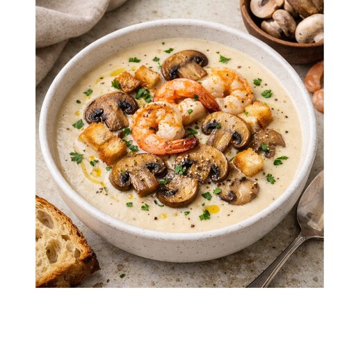 Нежный суп-крем, который перенесёт вас в мир утончённых вкусов — бархатистая текстура картофеля и моркови гармонично сочетается с изысканностью креветок и грибов, а сливки и сыр добавляют глубину и кремовость. Аппетитная зелень придаёт блюду свежесть и завершённость. Этот суп станет настоящим открытием для любителей сытных и ароматных первых блюд.